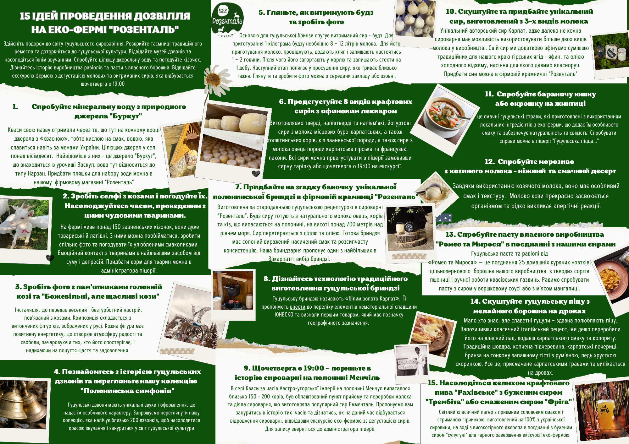 - Дізнайся історію гуцульських дзвонів та переглянь колекцію "Полонинська симфонія" в еко-фермі "Розенталь".