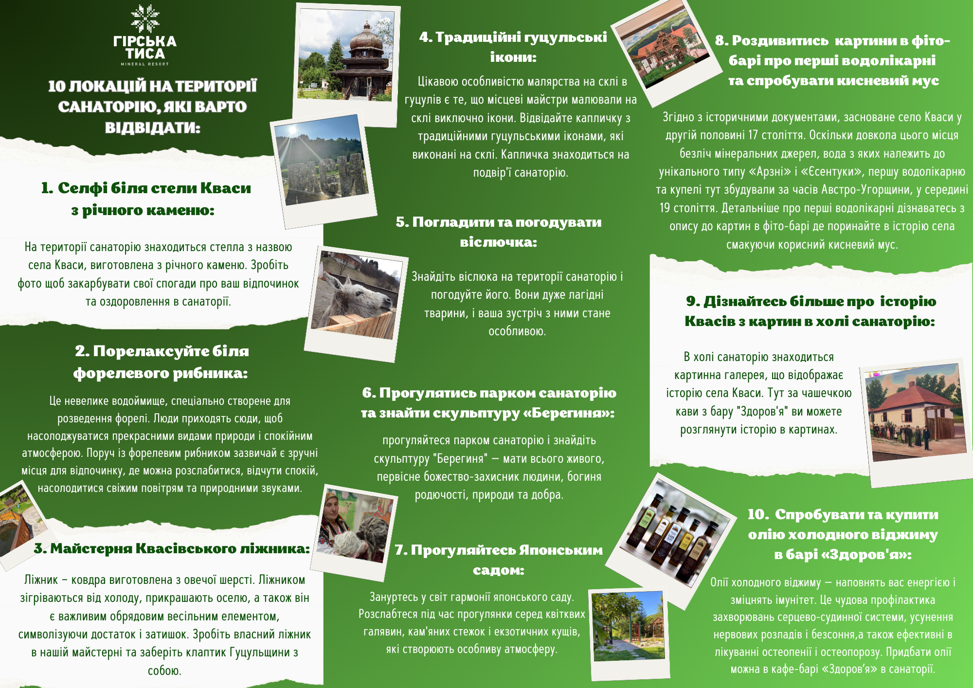 Запрошуємо Вас в подорож до села Кваси – місця, де кожен куток наповнений неймовірними враженнями та можливостями. Відкрийте для себе аромати та смаки гуцульської кухні, зануртеся у крафтовий світ справжніх сирів та вишуканих напоїв, а також насолодіться неперевершеною природою Карпат. Ваше перебування в Квасах – це незабутні враження, які запам'ятаються на довго!