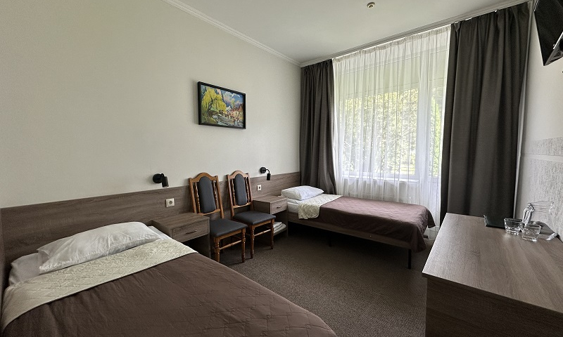 Зручний, невеликий номер категорії «Економ», створений для гостей, які віддають перевагу мінімалізму. У номері є два односпальні ліжка та вихід на балкон. З балкону відкривається чудовий краєвид на Карпатські гори. Також у номері є окремий санвузол з туалетом, душем та раковиною. Для відпочивальників завжди доступно мило, туалетний папір та набір чистих рушників. При необхідності, гостям безкоштовно надаються праска та дошка для прасування. Номери категорії Економ розташовані на першому поверсі спального корпусу санаторію