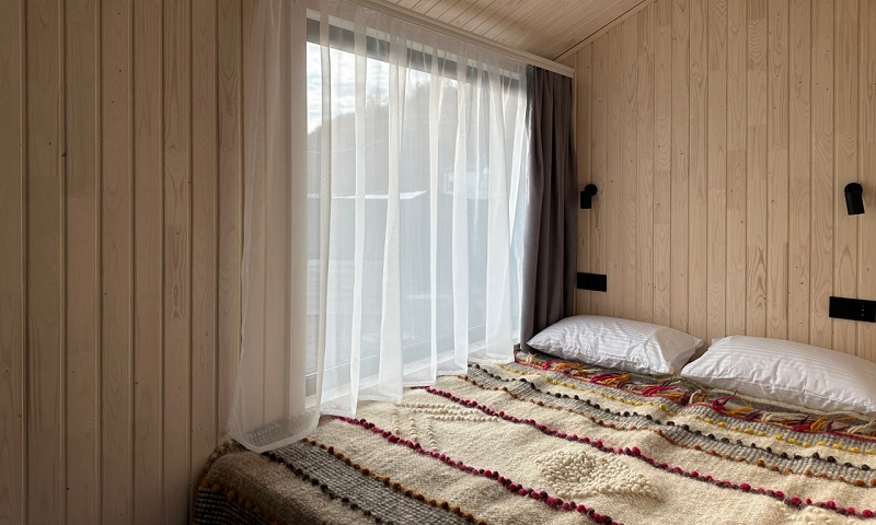 Інтер’єр виконаний у світлих натуральних тонах з використанням дерева, що формує теплу, затишну атмосферу та добре поєднується з гірським оточенням. Простір продуманий і функціональний: окрема спальня з повноцінним двоспальним ліжком, панорамне вікно з природним освітленням, житлова зона з диваном та виходом на терасу.
